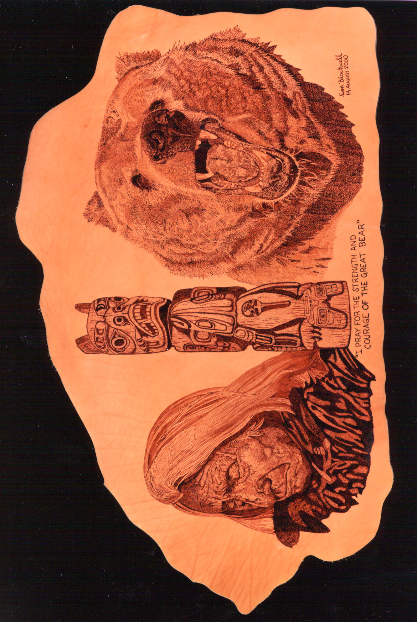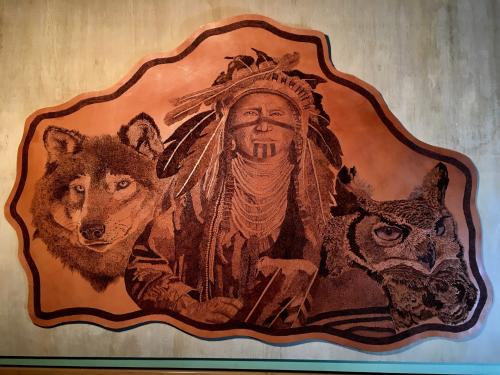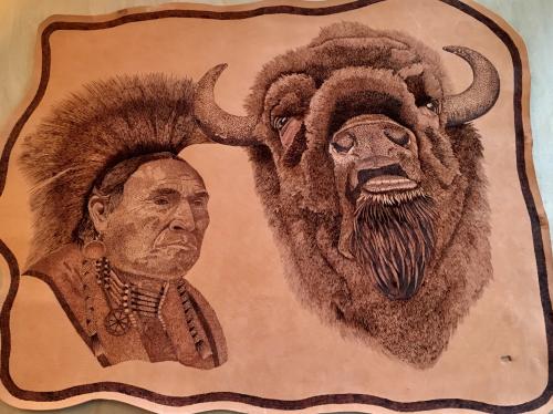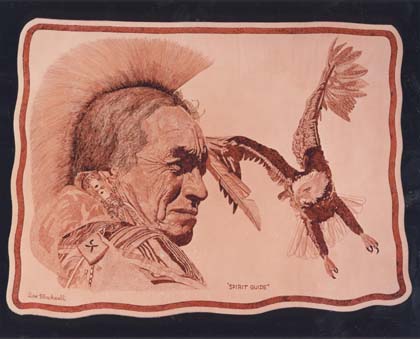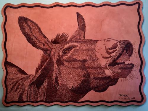 Don has extended his fine art of pointillism and fine strokes on paper to leather by using heat application. If you see any you like, please contact us and we'll let you know what is currently available for purchase, or show you more that aren't pictured here.